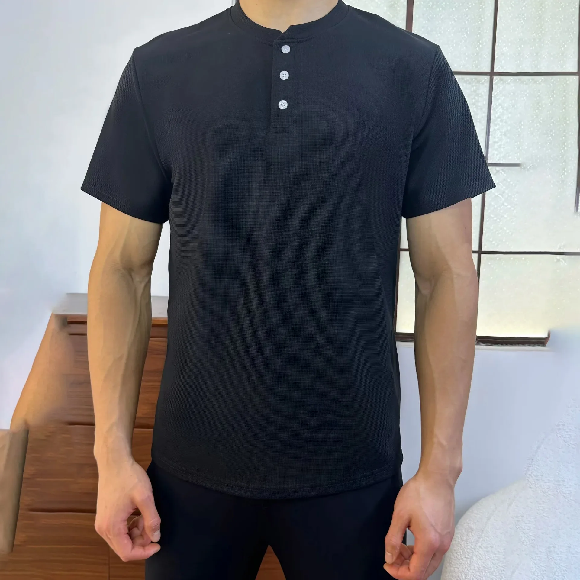 AMZ Custom Summer Slim Fit Style T-Shirt US Size Short Sleeve Button up Tees Casual Henley Woven Solid Mens t Shirt