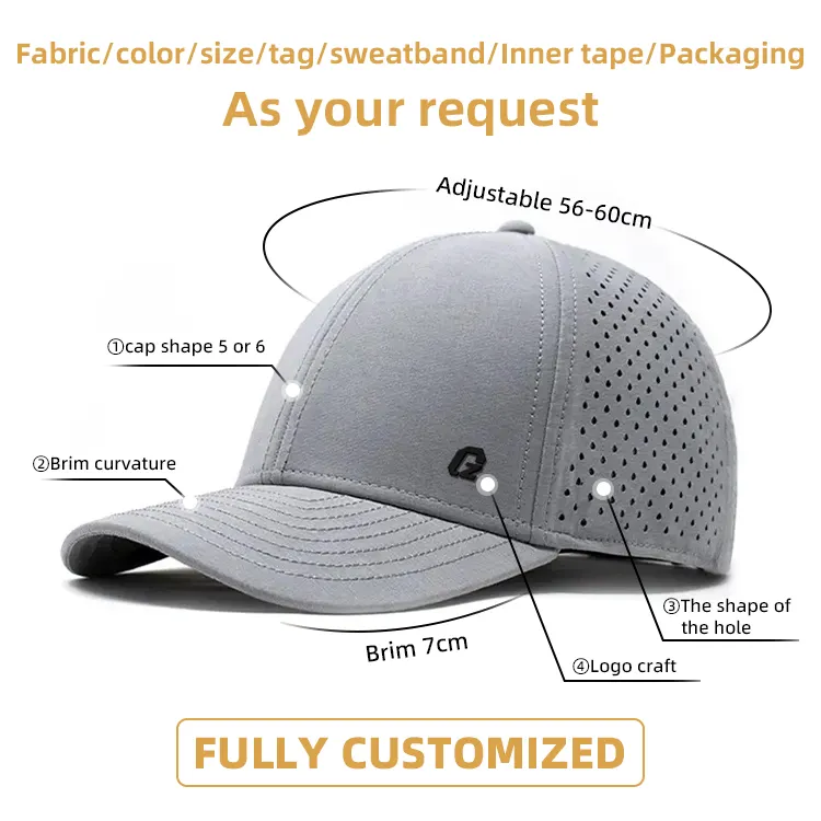 Bsci Breathable Rubber Label Waterproof Sport Performance Laser Cut Hat 6 Panel 5 Panel Golf Hat Custom Baseball Cap