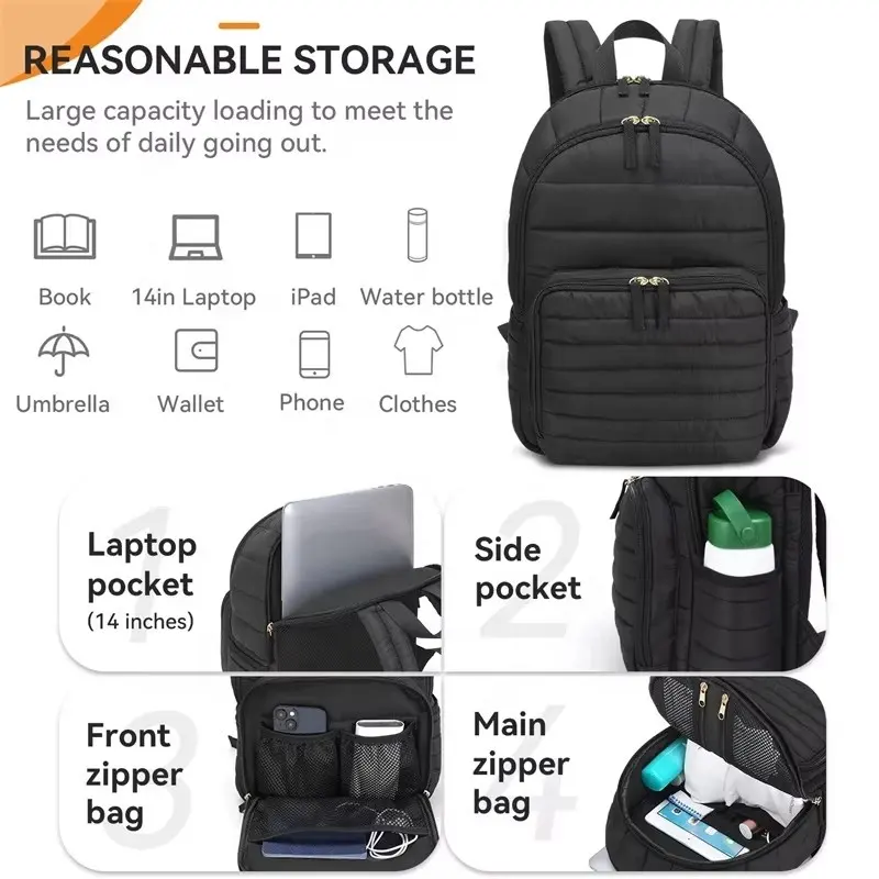 Custom Fashion Multi Pocket Lightweight Quilted Nylon Puffer Backpack with Laptop Compartment for Travel Daily Use
