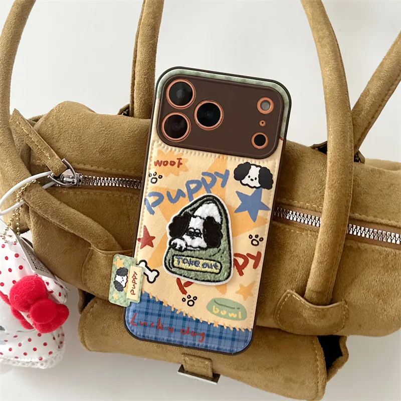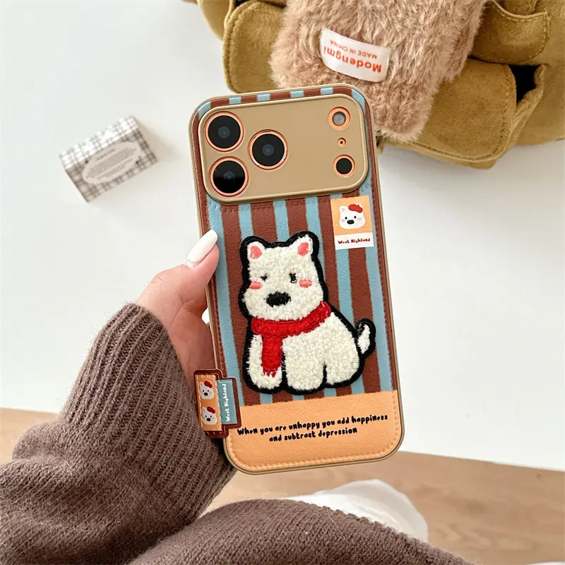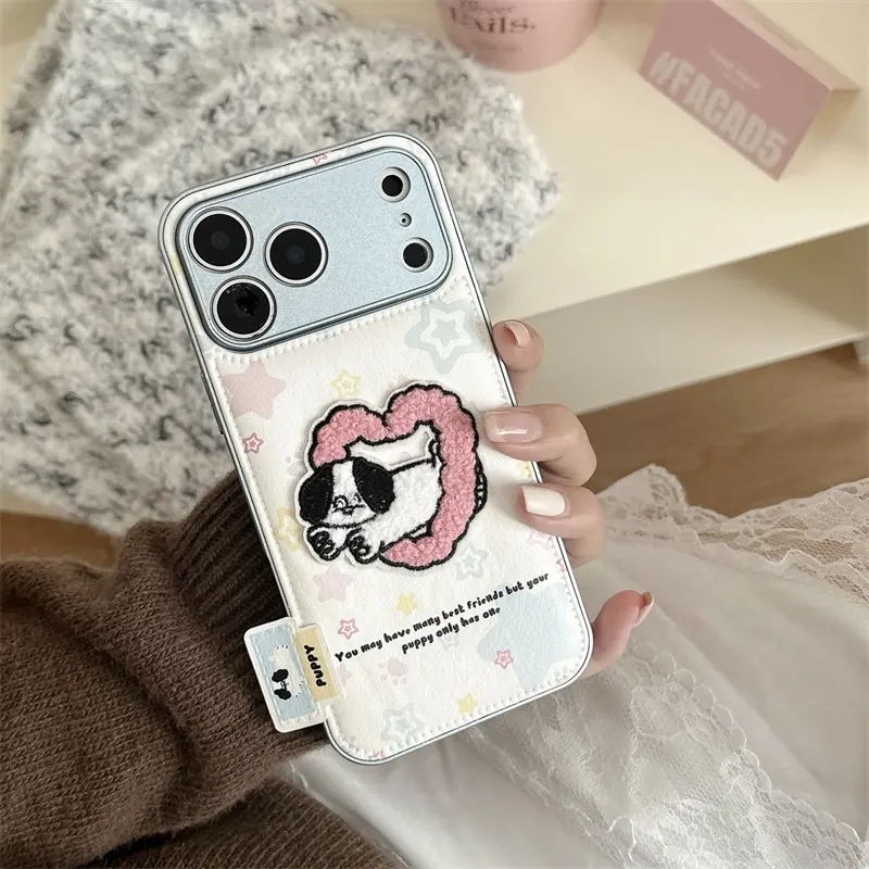 Cute Puppy Plush Puffer Leather Phone case for iPhone 17 Air 16 15 14 Pro Max love Cartoon Dog Fabric PC Tpu Back DIY Cover