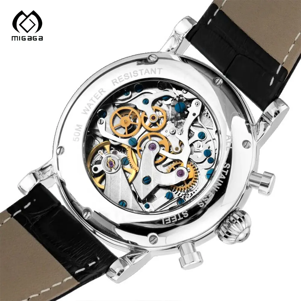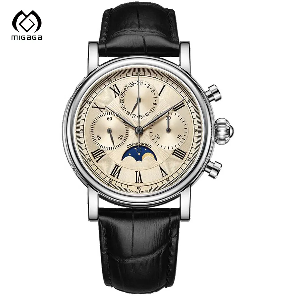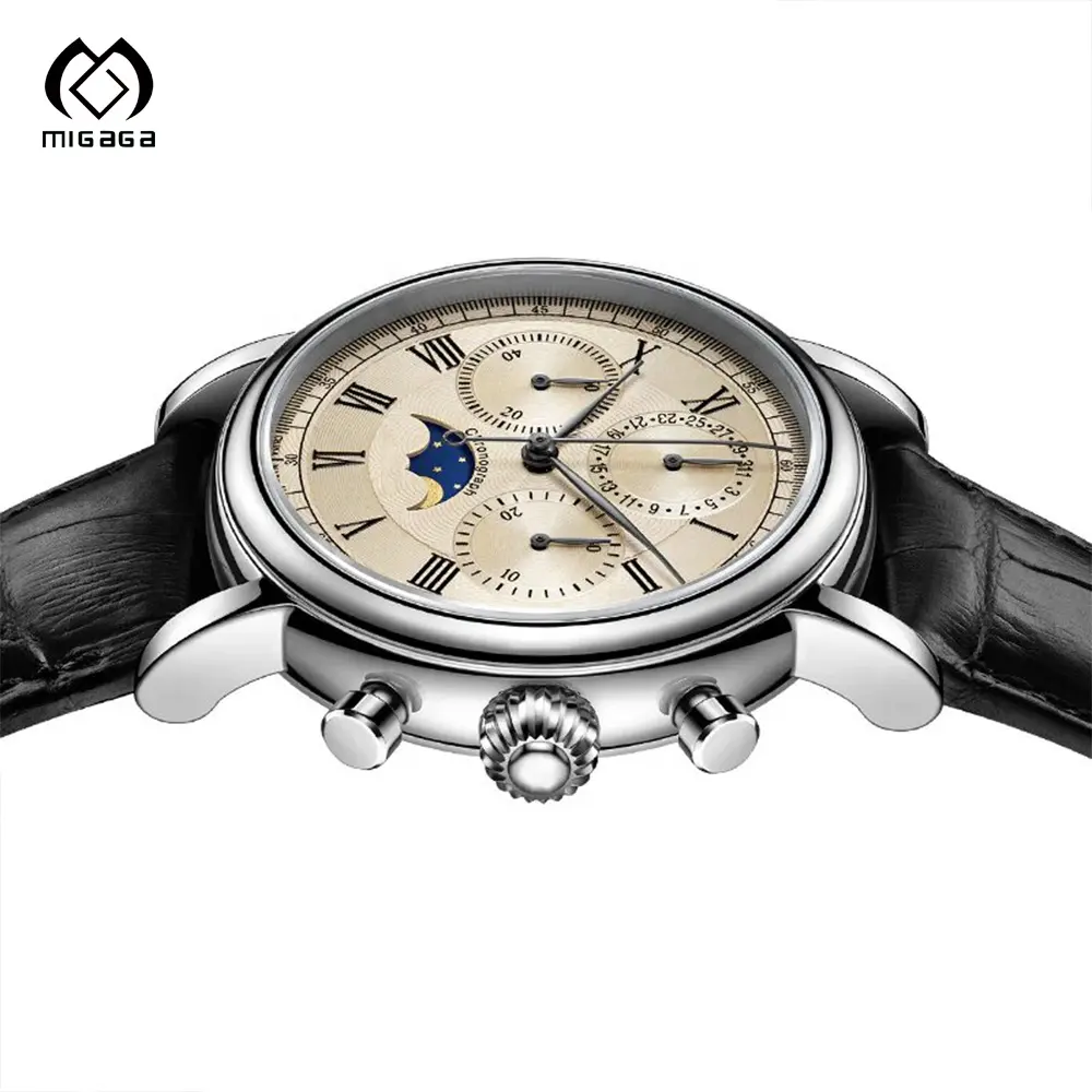 Factory Custom Stainless Steel case Leather Trap Japan Movement Men's Automatic Sun and Moon Phase Watch