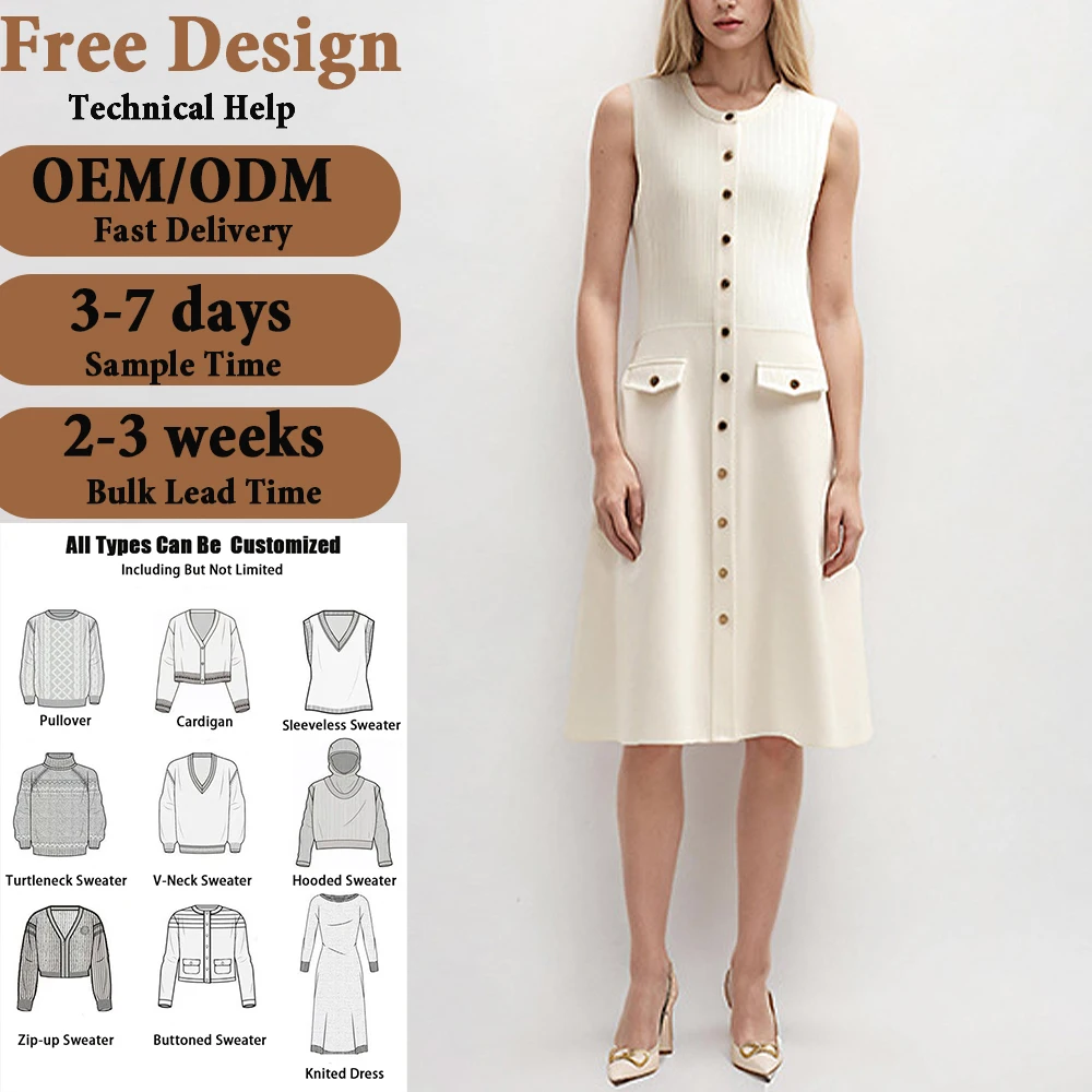 Custom Open Knit Dress Ladies Knitwear Cotton Stitch Sleeveless Crew Neck Women Sweater Knitted Long Maxi Dress Girls