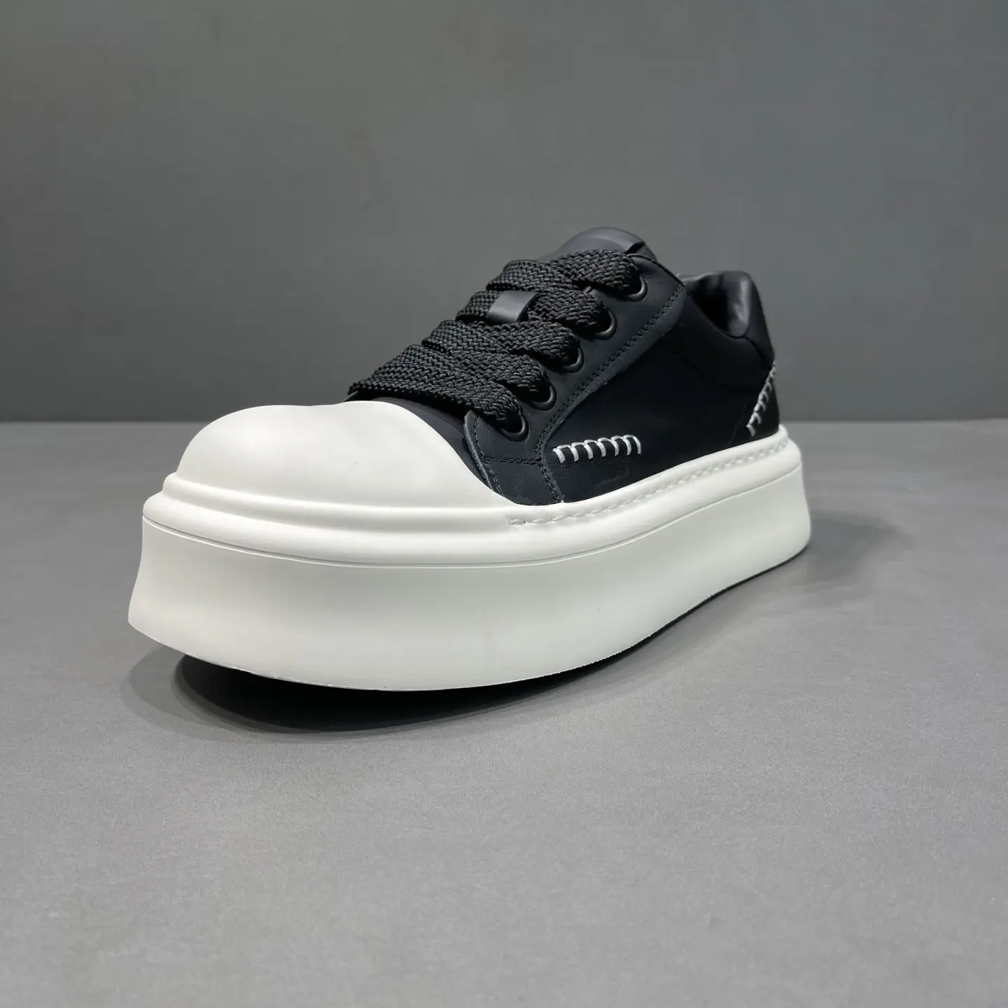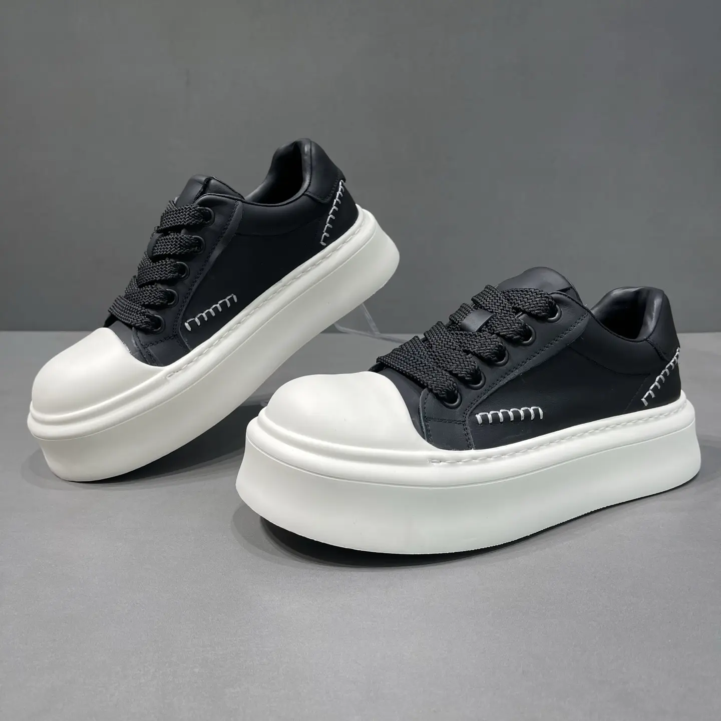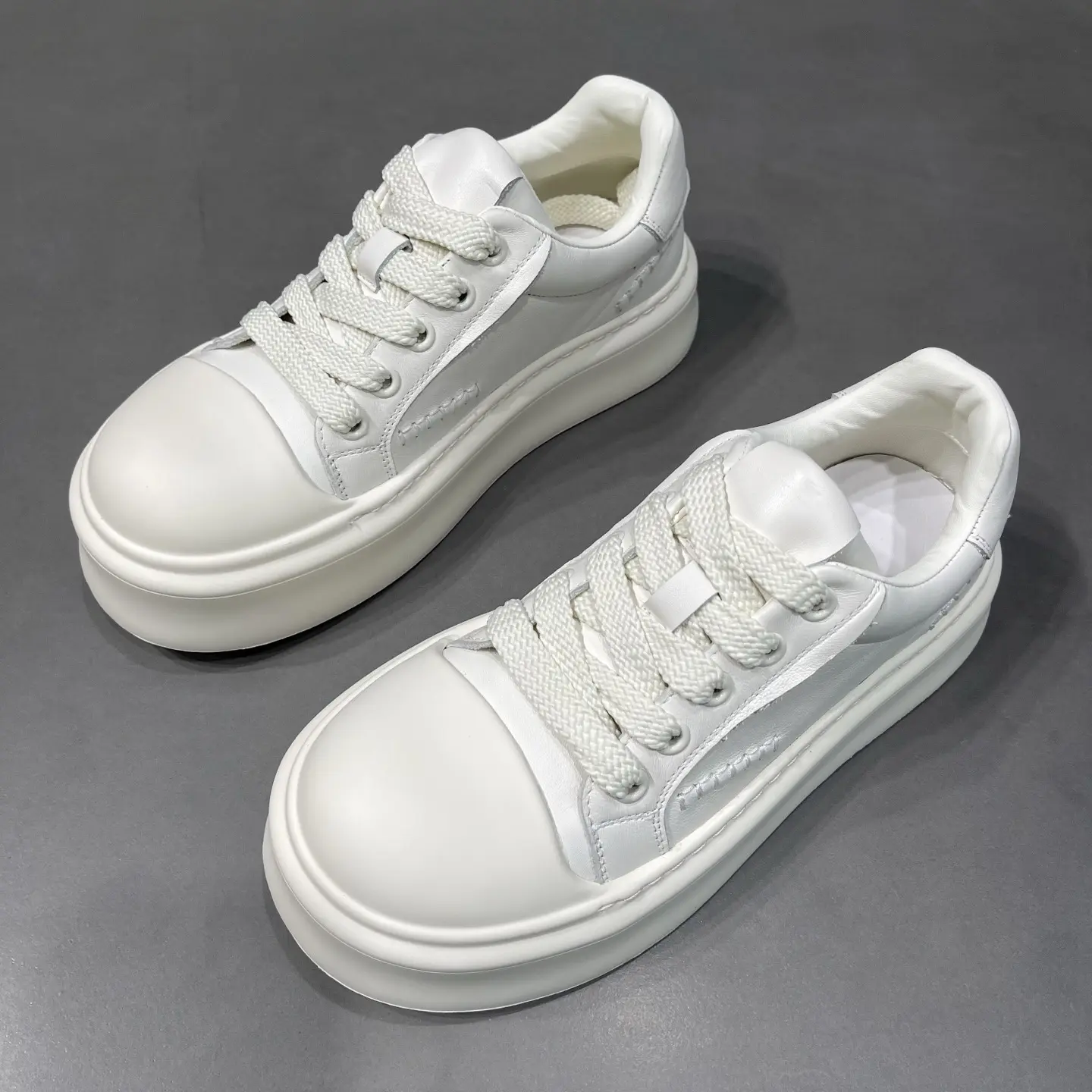 Men's Thick Sole White Round Head Autumn Leather Sneakers Fashionable Sports Casual Shoes Rubber Outsole Sheepskin Lining