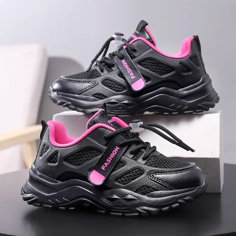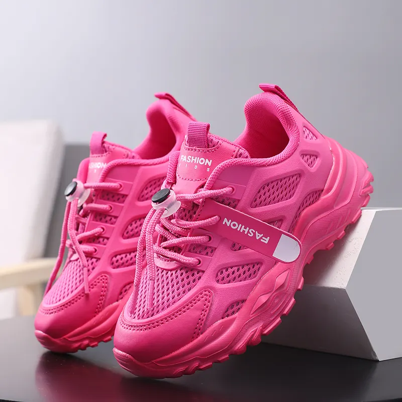Pink High Quality Kids Sports Running Shoes Girls Boys Children Breathable PU Mesh Upper EVA Midsole Anti-Skid Outsole Four
