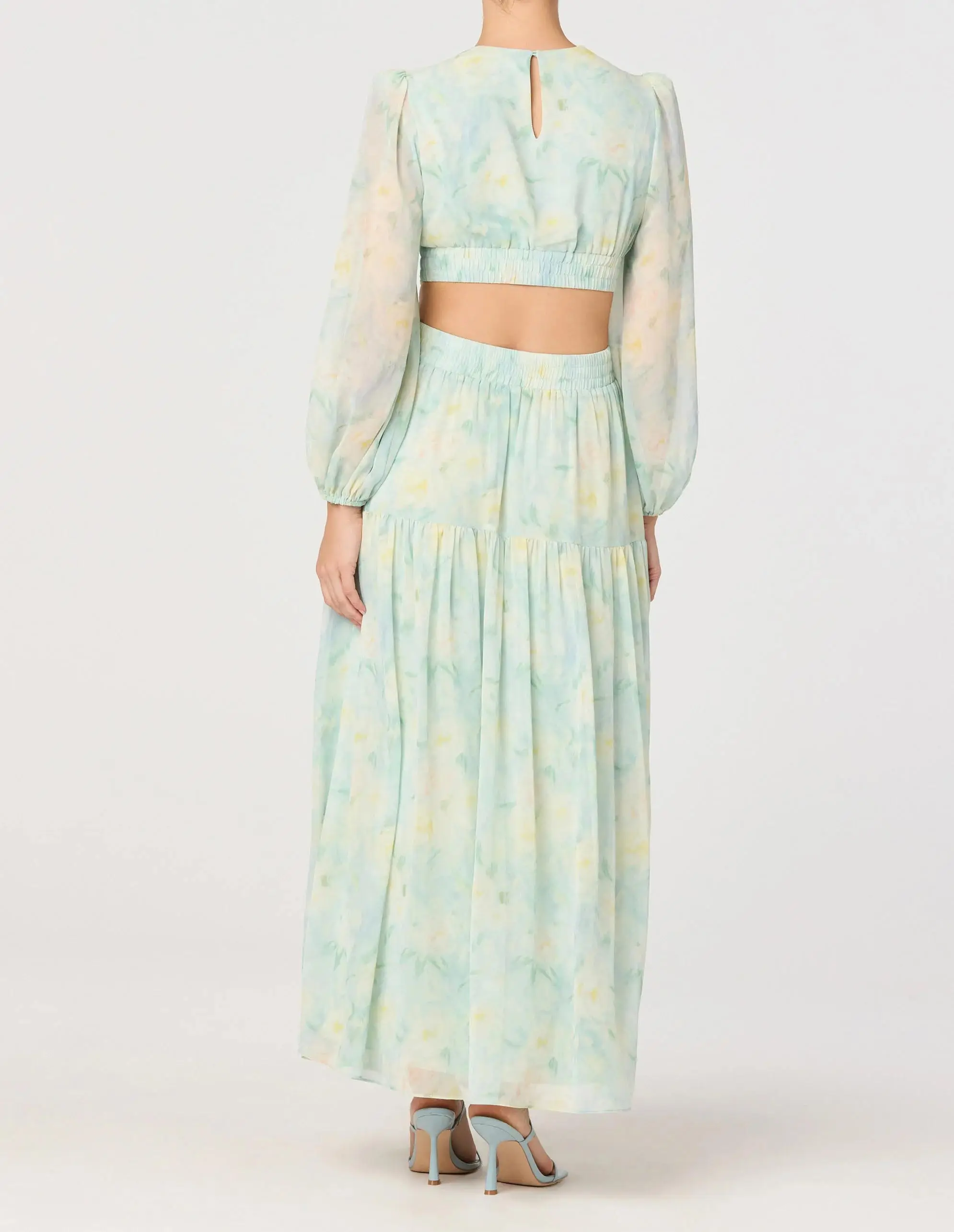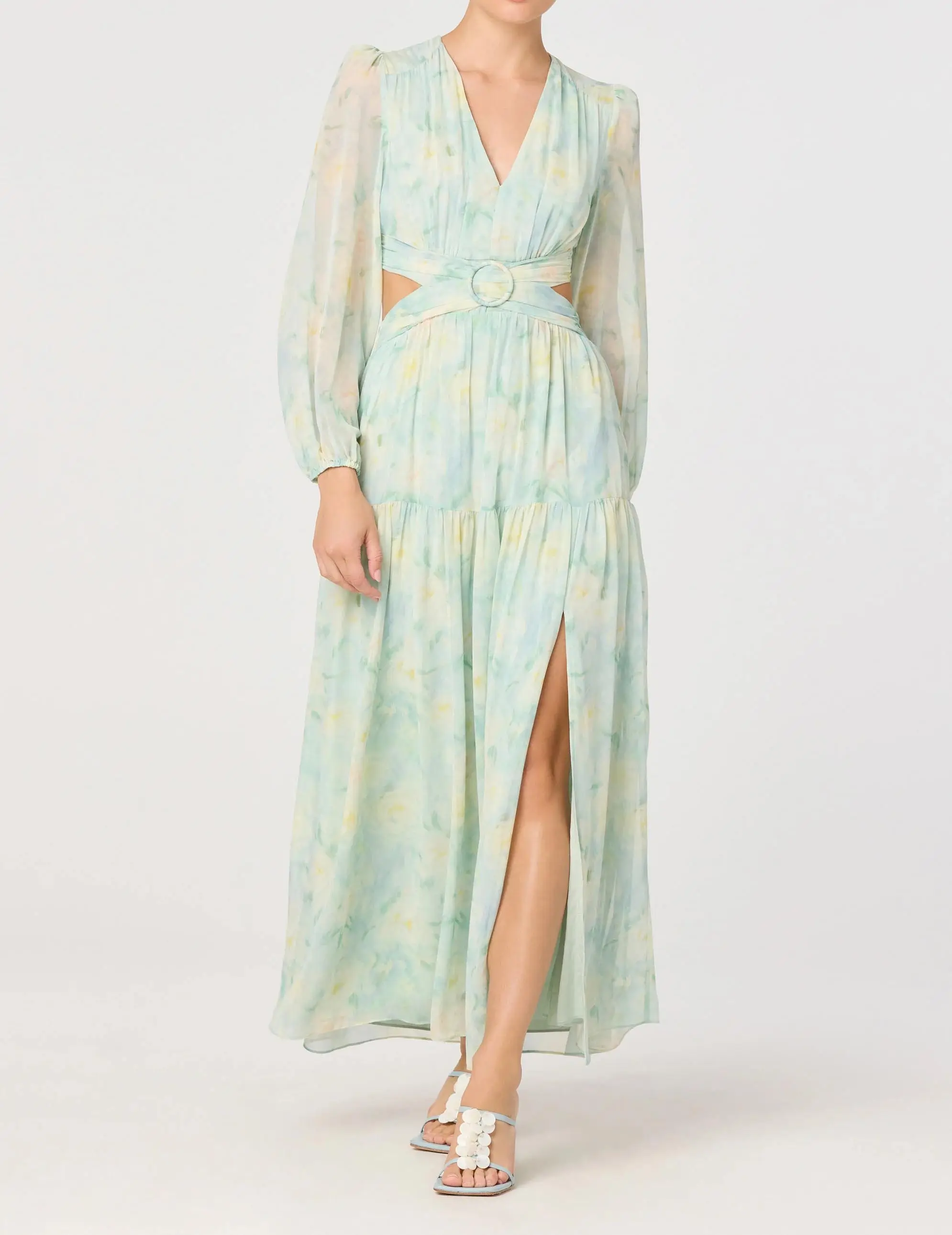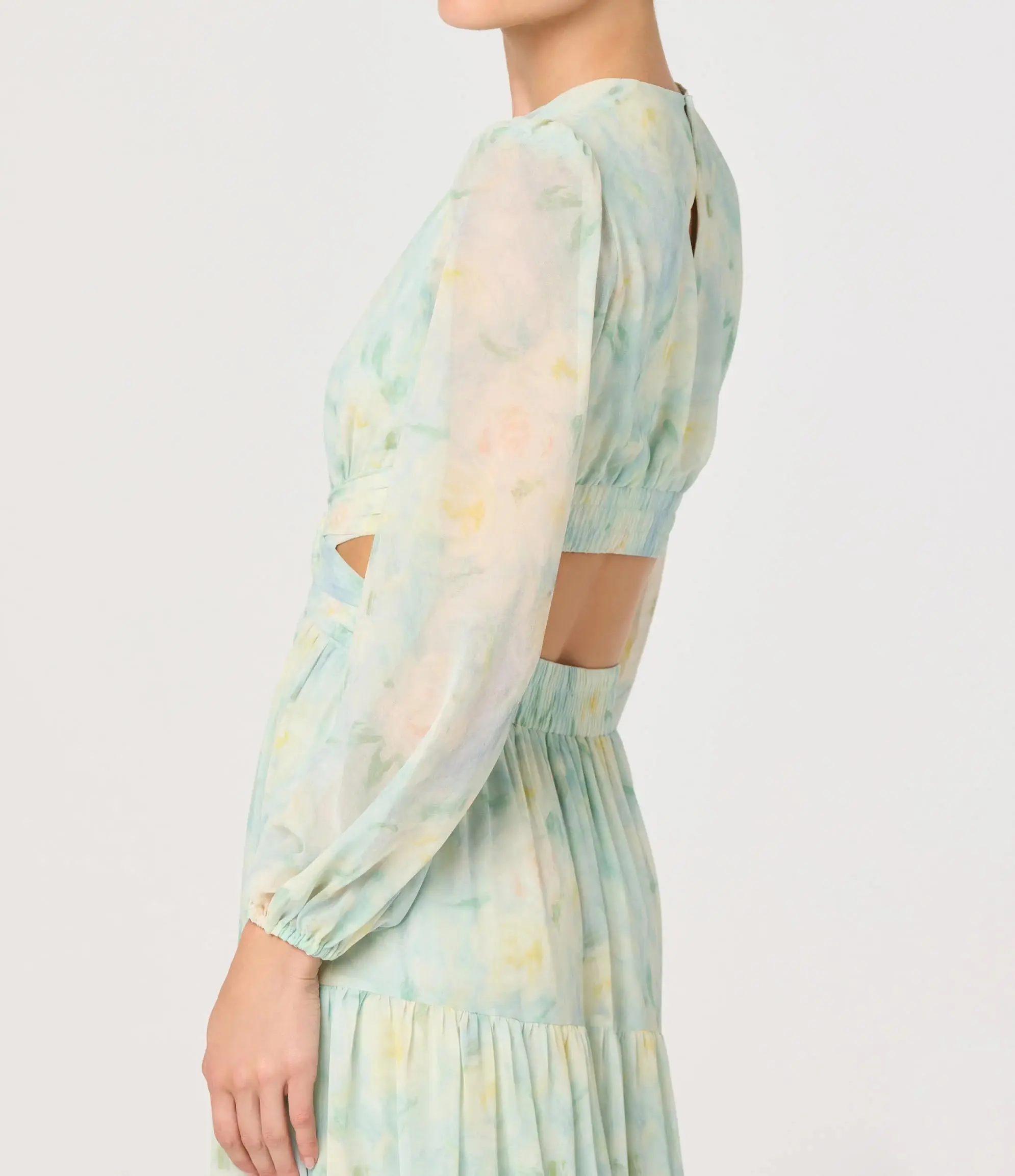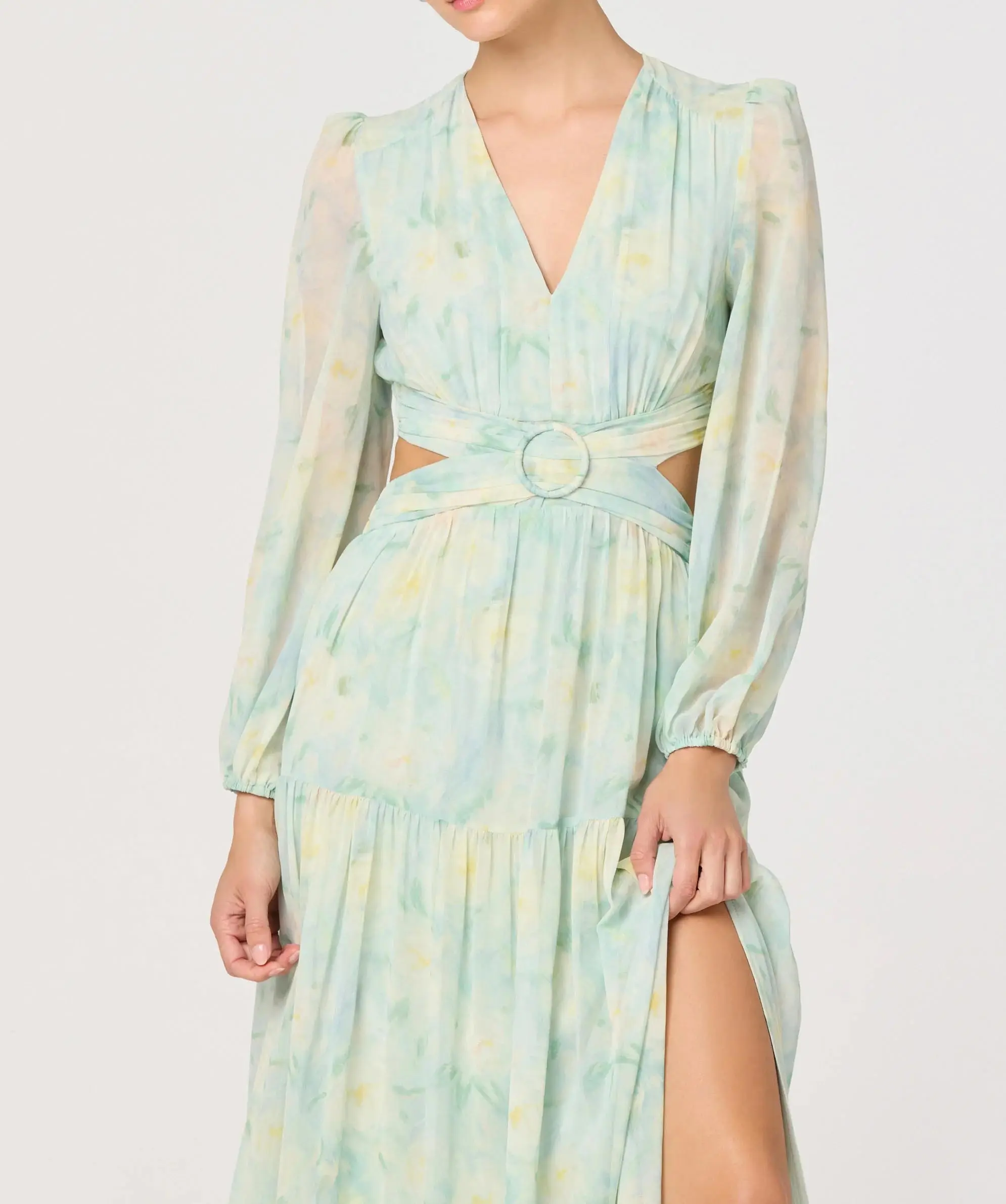 Women's Mint Green Watercolor Print Cut Out Waist Maxi Dress Long Sleeve Chiffon Spandex Sweet Natural Waist Slits for Vacation